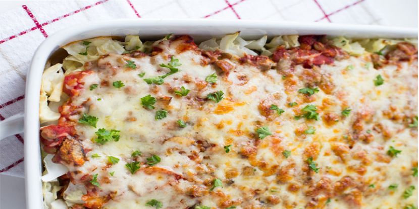 5. Use a paper towel to blot the cabbage to make sure it's dry, then distribute half of it along the bottom of the dish and top with half of the sauce. Layer the remaining cabbage on top and finish with the remaining sauce. Top with cheese.